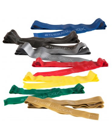 La banda CLX Theraband proporciona múltiples opciones de agarre único que permiten ejercicios de mano abierta y cerrada y ejercicios como el trabajo simultáneo superior e inferior del cuerpo. Además, permite sostener objetos con resistencia y realizar ejercicios sin necesidad de agarre. El CLX de Theraband ofrece versatilidad y facilidad de uso que pueden aumentar el cumplimiento de los ejercicios para mejorar los resultados del paciente.