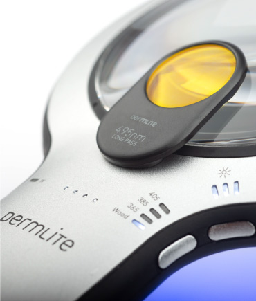 Su gran lente asférica de 100 mm de diámetro con aumento de 2.3x permite una visualización inigualable de las estructuras dermatológicas con una claridad óptica excelente. Puede elegir entre luz blanca polarizada o una de las tres longitudes de onda específicas: 365 nm, 385 nm en el espectro UV o luz azul de 405 nm. También puede seleccionar su modo de Wood, una mezcla especial diseñada para parecerse a la iluminación única de una lámpara de Wood, la cual puede ayudar a evaluar los bordes y la extensión de lentigo maligno, así como las cicatrices de escisión de melanoma para detectar signos de recurrencia, entre otros. Los cinco modos están disponibles en tres niveles de brillo.